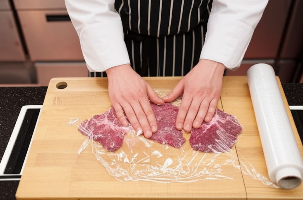 Mięso opłucz, wysusz i podziel na porcje po około 40 g. Potem rozbij tłuczkiem.