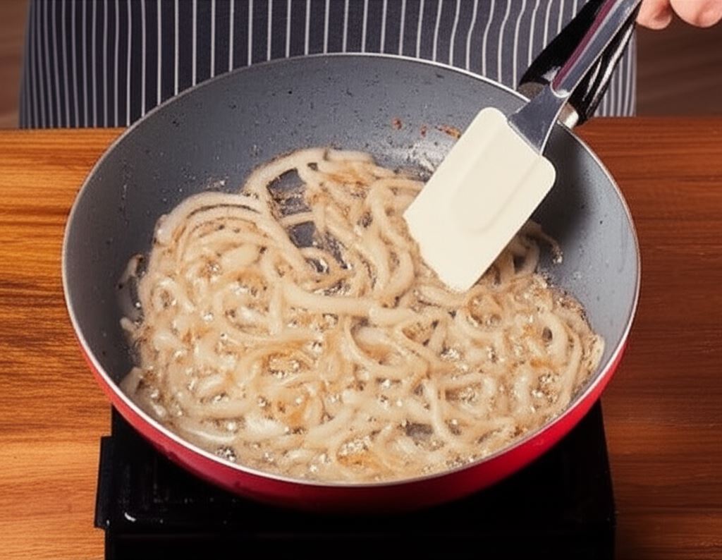 Gdy będą złociste przenieś je do rondla. Na tej samej patelni zrumień cebulę pokrojoną w piórka. Kiedy się zezłoci dodaj ją do mięsa.
