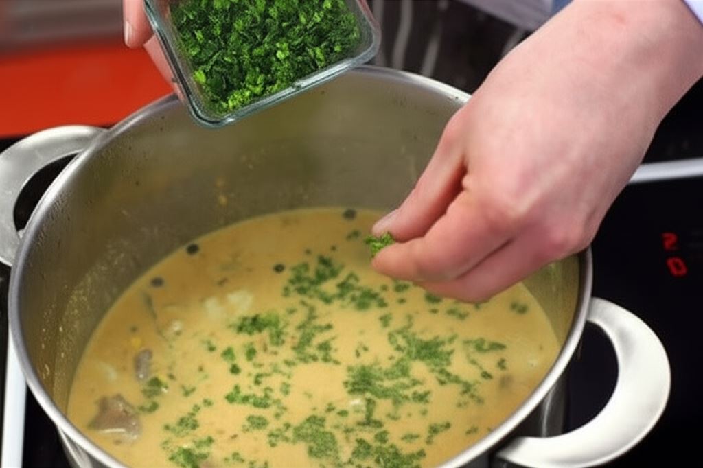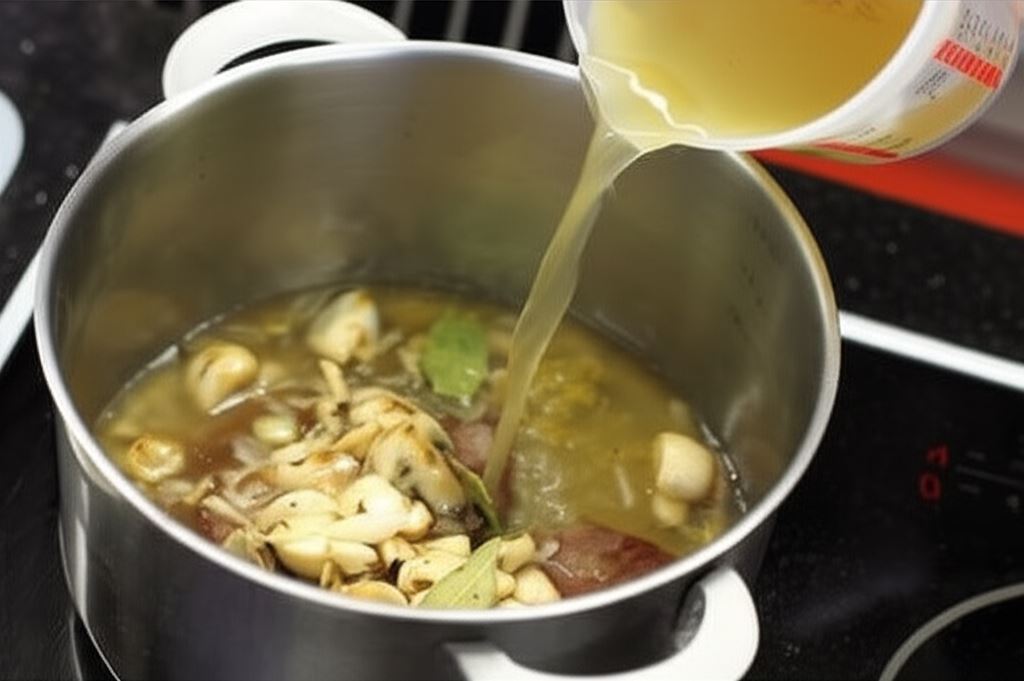 Wlej bulion do rondla, wsyp przyprawy i duś mięso przez około 20 minut na średnim ogniu.