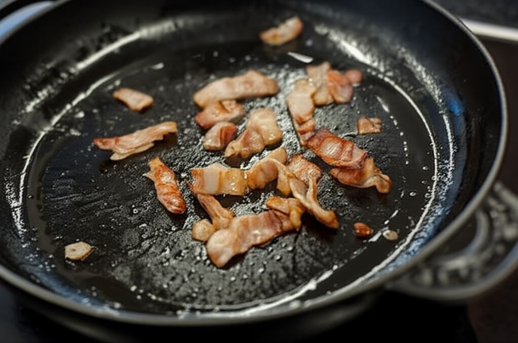 Boczek potnij na mniejsze kawałki, umieść na rozgrzanej patelni i smaż, dopóki tłuszcz się wytopi, a kawałki mięsa staną się złociste i chrupiące.