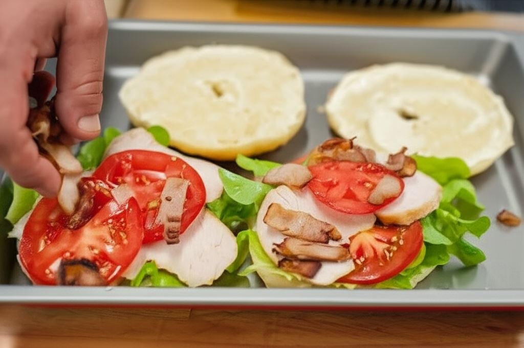 Na posmarowane majonezem połówki kładź po kolei liście sałaty, plastry pomidora, pieczonego indyka i boczku. Kanapkę nakryj górną warstwą bułki. Przetnij na połowę i serwuj, dopóki bajgle oraz boczek są ciepłe.