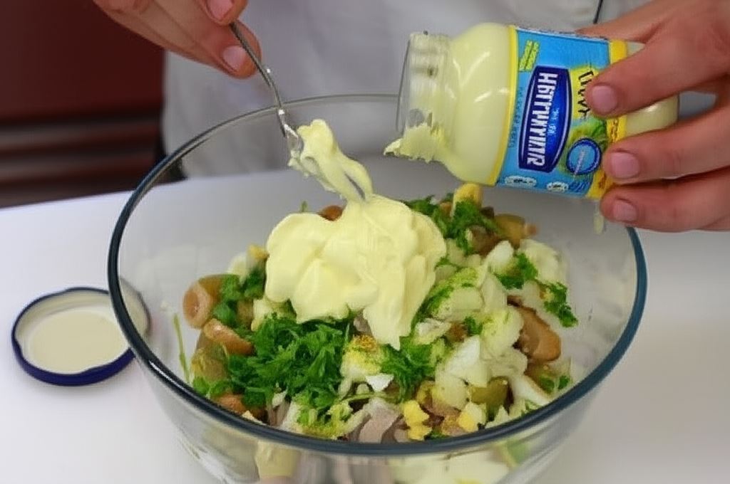 Połącz wszystkie składniki z majonezem i posiekaną zieleniną. Przypraw do smaku.