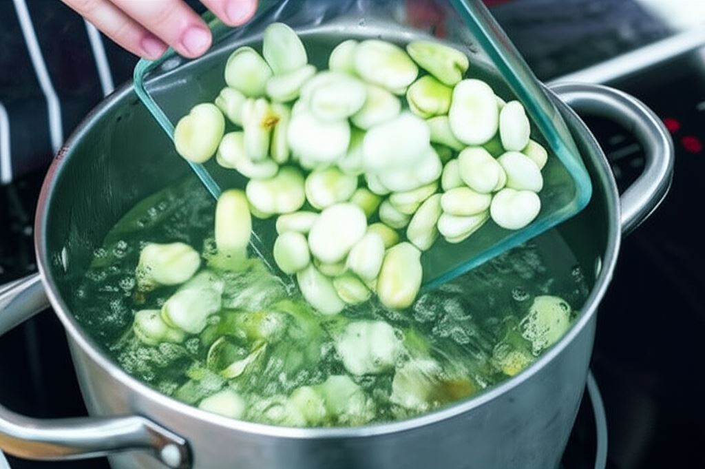 Wrzuć świeży bób do osolonej, gotującej się wody. Gotuj przez około 8 minut. W tym samym płynie sparz oczyszczoną fasolkę szparagową i gotuj ją przez około 10-12 minut. Zdejmij skórę z bobu, fasolkę podziel na mniejsze części.
