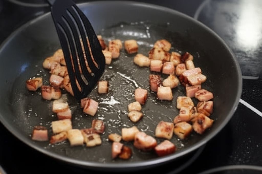 Boczek pokrój w kosteczkę i przysmaż na chrupiące skwarki. Na papierowym ręczniku osącz boczek z tłuszczu i połącz z bobem oraz fasolą.