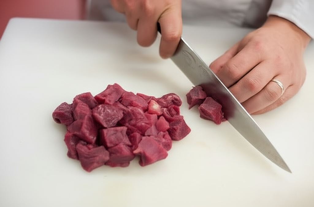 Wołowinę przepłucz pod zimną, bieżącą wodą. Wysusz papierowym ręcznikiem i potnij w kostkę około 2x2 cm.
