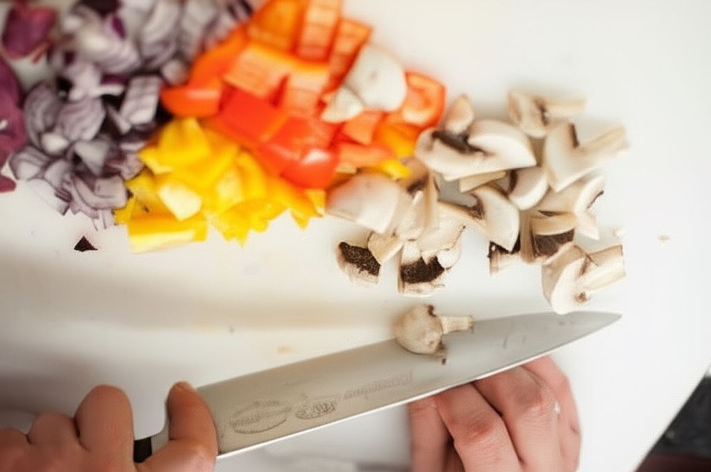 Cebulę posiekaj w kostkę, czosnek przepuść przez praskę lub drobno pokrój. Paprykę pokrój w kostkę około 1x1 cm, pieczarki podziel na ćwiartki.