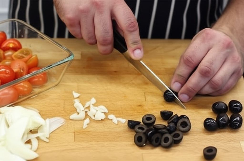 Cebulę posiekaj w paski, czosnek w plasterki, a pomidorki i oliwki na połówki.