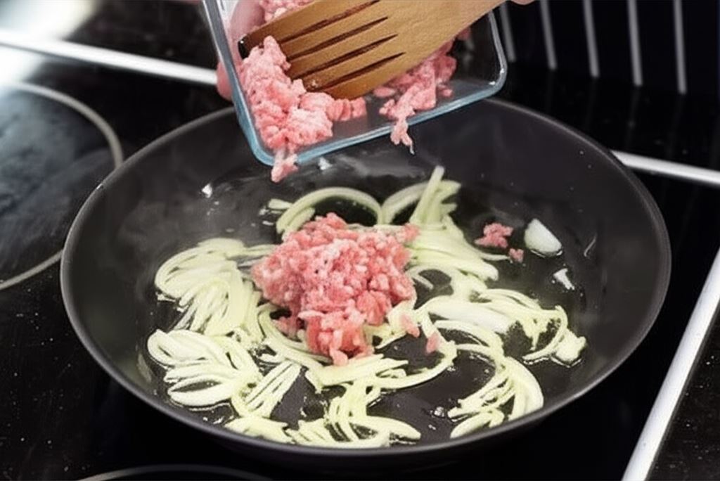 Mięso mielone z cebulą i czosnkiem podsmaż do zrumienienia. Makaron ugotuj.