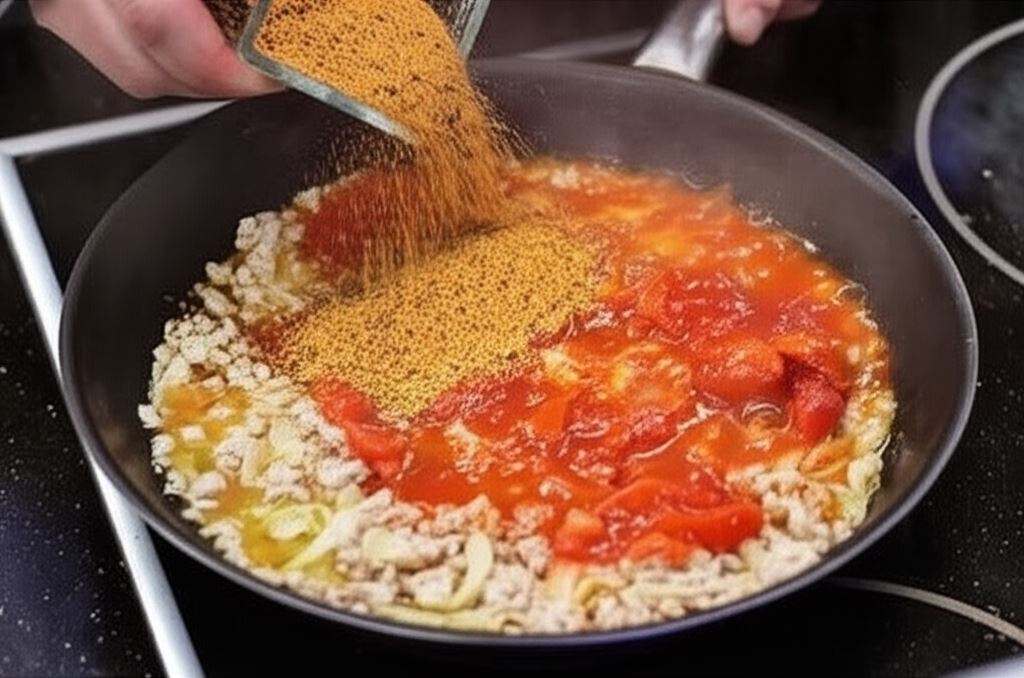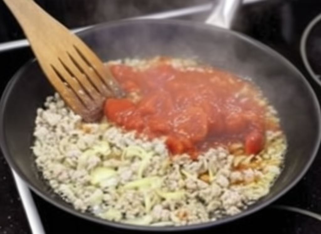 Do mięsa wsyp rozdrobnione pomidory konserwowe razem z płynem.