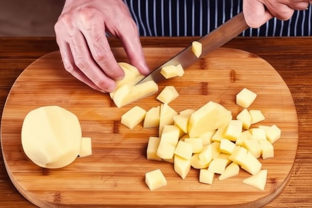 Posiekaj ziemniaki w małą kostkę i dodaj do rosołu.