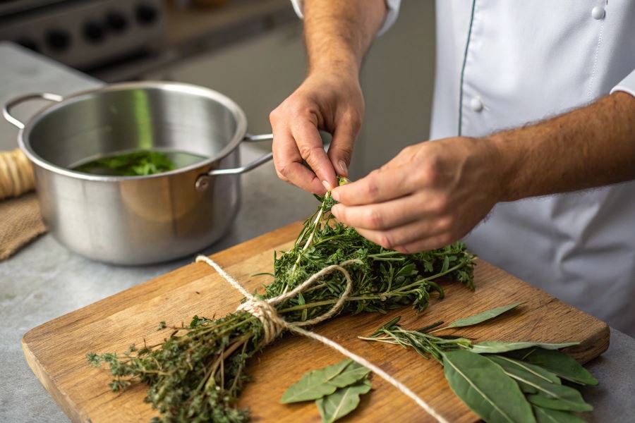 - Metoda tradycyjna: Związanie świeżych ziół (tymianek, rozmaryn, liść laurowy) bawełnianym sznurkiem kuchennym, co pozwala na łatwe wyjęcie po zakończeniu gotowania