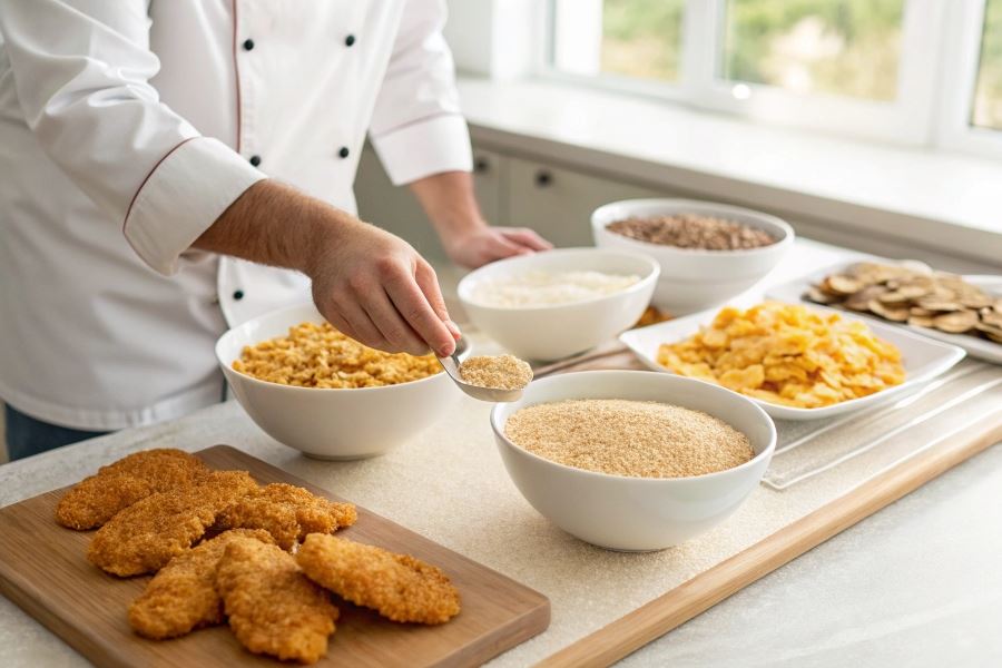 Płatki kukurydziane stanowią doskonały zamiennik bułki tartej, szczególnie gdy zależy nam na chrupiącej panierce. Wystarczy rozdrobnić je w blenderze lub malakserze do konsystencji przypominającej bułkę tartą. Płatki kukurydziane nadają potrawom wyjątkowy, słodkawy posmak i intensywniejszy kolor. Sprawdzają się idealnie do panierowania kotletów drobiowych i rybnych.