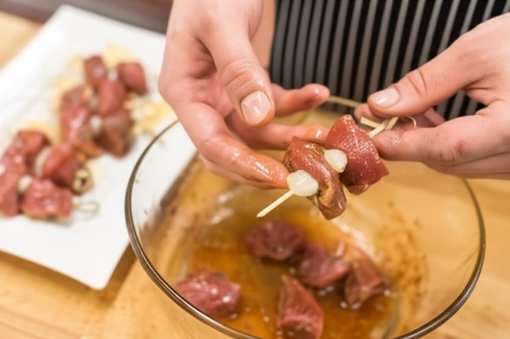 Kaczkę pozbaw skóry, pokrój w kostkę. Umieść ją w marynacie i starannie wymieszaj. Odstaw na 24 godziny. Po upływie tego czasu kawałki kaczki nabij na szaszłyki, przekładając mięso cebulką perłową.