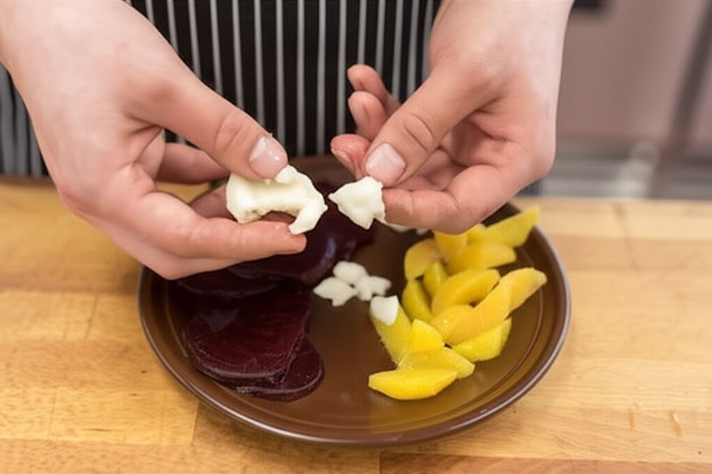W tym czasie przygotuj sałatkę. Wyciśnij sok z cytryny, buraka pokrój w półkrążki, pokrusz kozi ser, z pomarańczy wytnij segmenty.