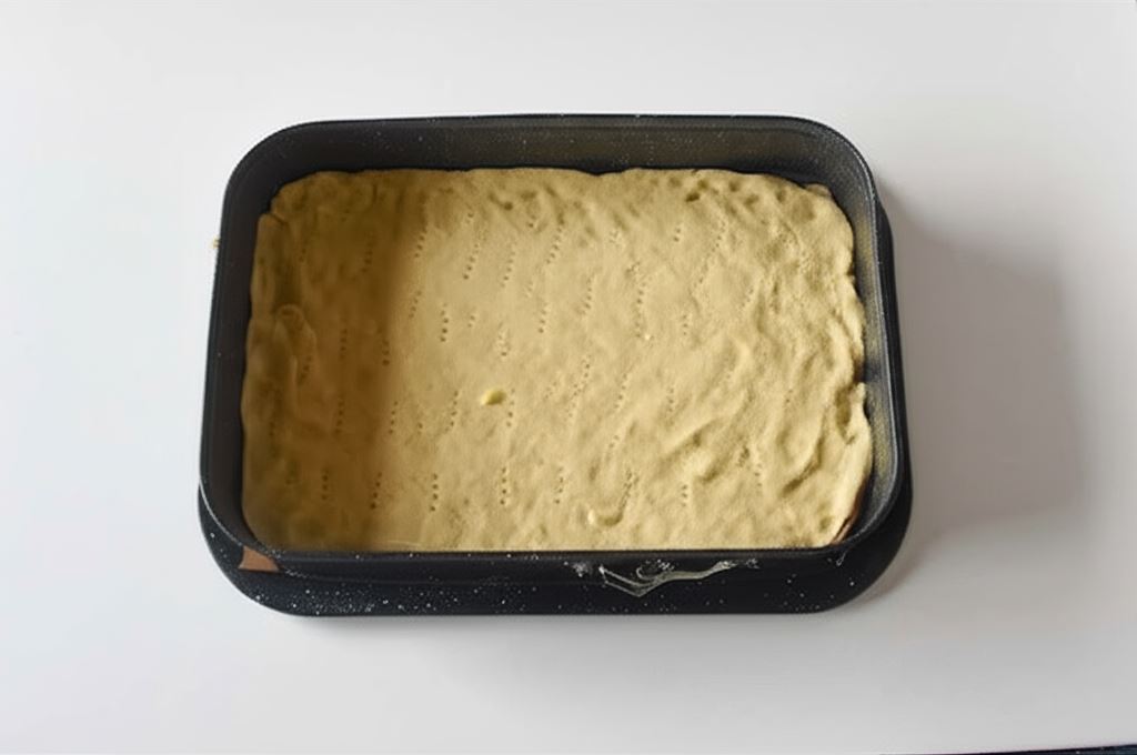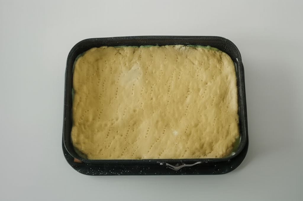 Wyjmujemy ciasto z lodówki. Rozdzielamy je na dwie części. Wykładamy blaszkę papierem do pieczenia. Nagrzewamy piekarnik do 180 stopni. Pierwszą część ciasta rozwałkowujemy na rozmiar blaszki. Podsypujemy mąką. Umieszczamy ciasto w blaszce. Nakłuwamy je widelcem.
