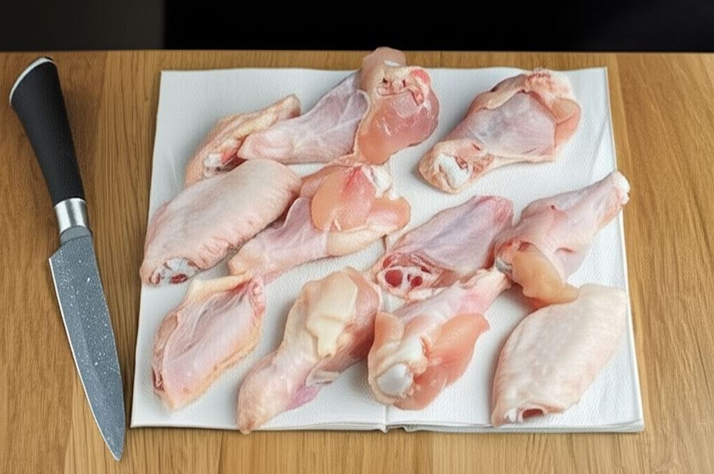 Skrzydełka przetnij na połowę i starannie osusz przy pomocy papierowego ręcznika.