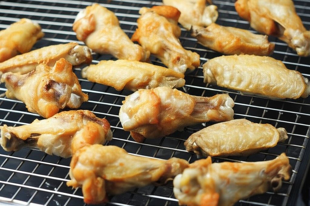 Usmażone skrzydełka przenieś na kratkę by usunąć nadmiar tłuszczu i utrzymać ich chrupkość.