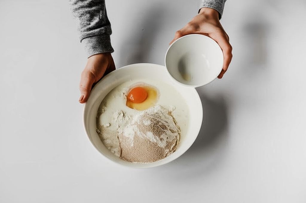 Przesiewamy mąkę do miski. Dodajemy ciepłe mleko, rozpuszczone masło, jajko, dosypujemy cukier, sól i drożdże instant.