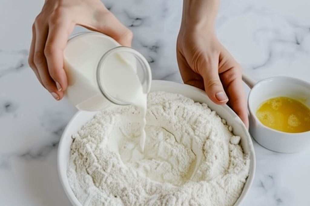 Przesiewamy mąkę z cukrem pudrem do miski. Wsypujemy drożdże i mieszamy dokładnie. Wlewamy ciepłe mleko i dodajemy roztopione, wystudzone masło.