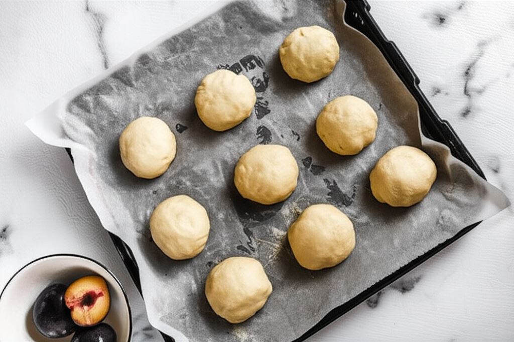 Na każdy fragment ciasta umieszczamy połówkę śliwki i zwijamy tak, by utworzyła się kula.