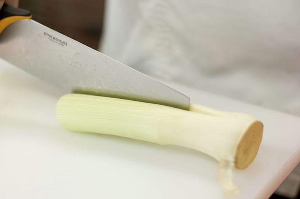 Usuń i odrzuć ciemnozieloną część pora. Białą część, która została, przekrój wzdłuż na połowę, nie docinając do końca i przepłucz pod bieżącą wodą.