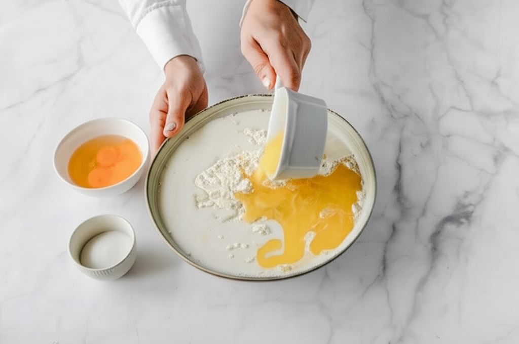 Mąkę łączymy z suchymi drożdżami. Dodajemy letnie mleko.
