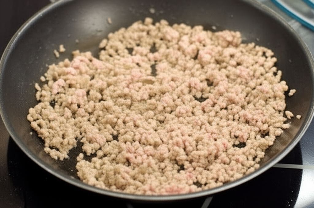 Mięso mielone zrumień na złocisty kolor na patelni z rozgrzanym tłuszczem.