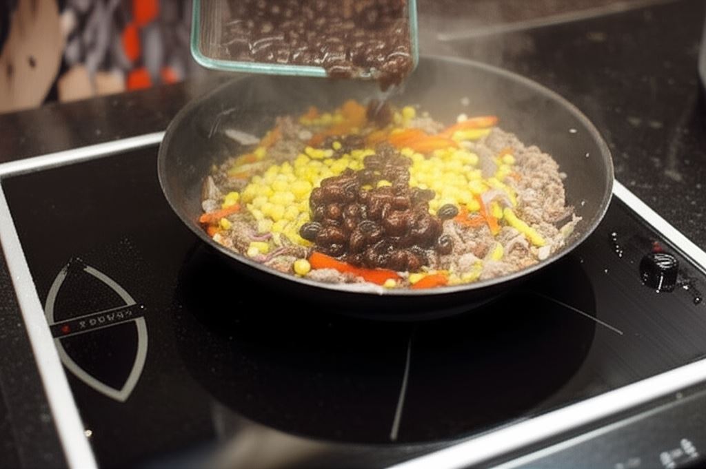 Cebulę posiekaj w piórka, paprykę oczyść z nasion i pokrój w cienkie paski, a czosnek drobno posiekaj. Warzywa dodaj do podsmażonego mięsa, wsyp fasolę i kukurydzę. Wszystko smaż jeszcze około 4 minut.