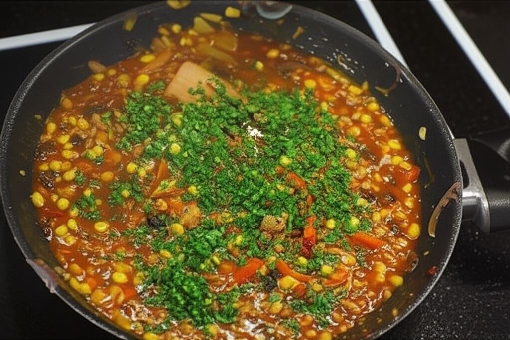 Potem wlej go na patelnię zawierającą mięso i warzywa, gotuj całość razem aż płyn odparuje. Po zdjęciu patelni z ognia wsyp posiekaną świeżą kolendrę.