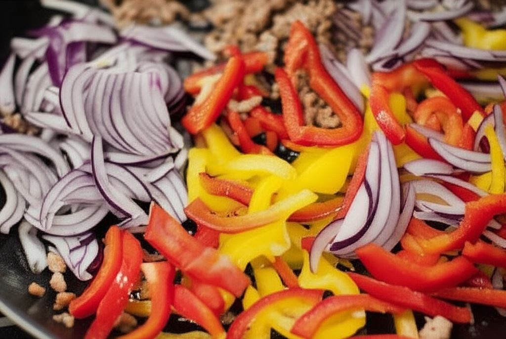 Cebulę posiekaj w piórka, paprykę oczyść z gniazda nasion i pokrój w cienkie paski. Warzywa wsyp do podsmażonego mięsa, potem dodaj fasolę. Wszystko smaż jeszcze przez około 4 minuty.