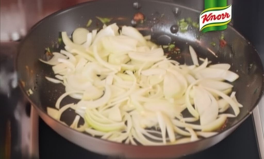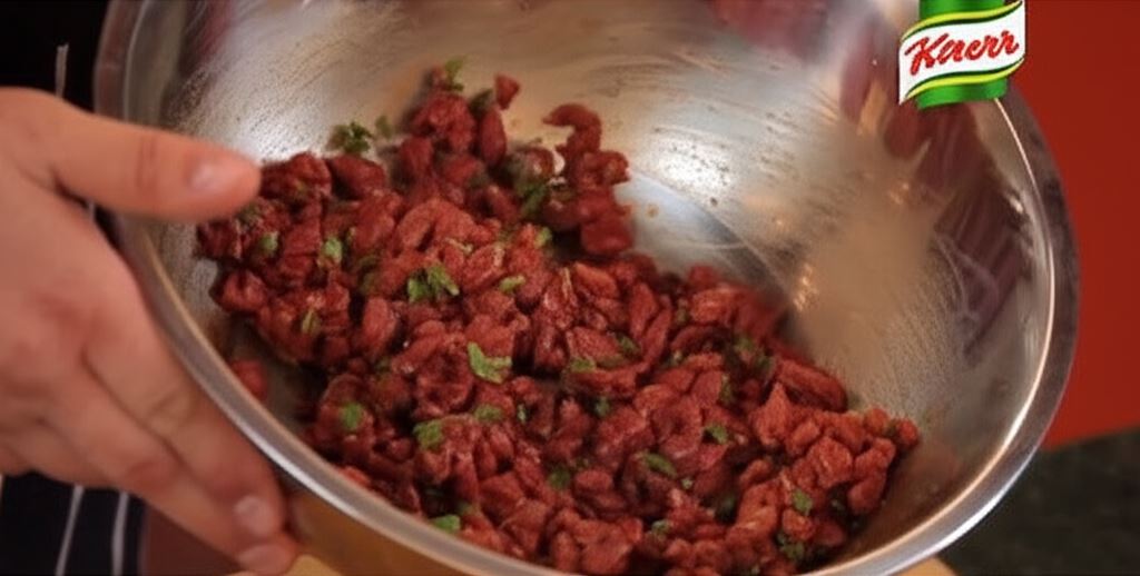 Mięso tniemy na plastry, a potem w małą kostkę. Wlewamy oliwę i dodajemy przyprawę do mięs Knorr, cynamon, goździki oraz posiekaną świeżą kolendrę. Mięso odkładamy na około 30 minut do lodówki.
