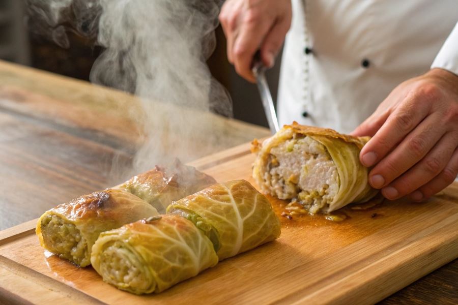 Sprawdzenie gotowości nadzienia bez rozcinania gołąbków wymaga precyzji. Wbij cienką wykałaczkę w środek gołąbka – powinna wchodzić bez oporu, a po wyjęciu być ciepła. Możesz również delikatnie nacisnąć środek gołąbka – powinien być sprężysty, ale nie twardy.