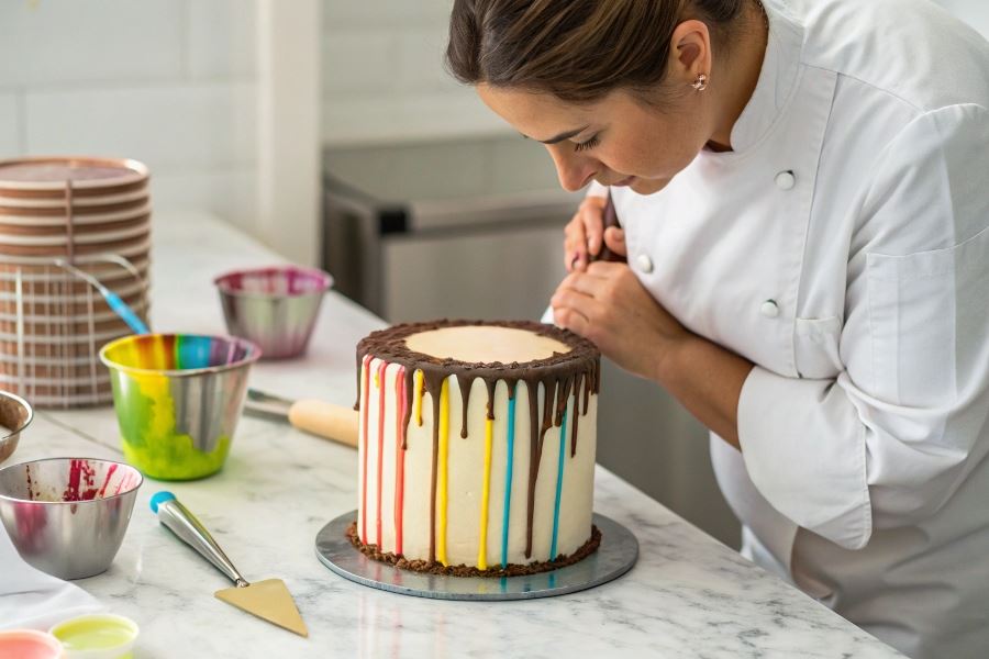 Profesjonalny trik: przygotuj dwie wersje polewy o różnej gęstości – gęstszą do pokrycia wierzchu tortu i nieco rzadszą do tworzenia efektownych kropli na bokach.