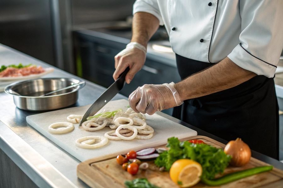 Prawidłowe przygotowanie kalmara zaczyna się od jego dokładnego oczyszczenia. Należy oddzielić głowę od worka trzewiowego, usunąć wnętrzności, wyciągnąć przezroczystą chrząstkę i zdjąć zewnętrzną błonę. Skórę można łatwo usunąć, zanurzając kalmara na kilka sekund w gorącej wodzie, a następnie ściągając ją palcami pod zimną bieżącą wodą. Macki należy odciąć tuż poniżej oczu, usuwając twardy dziób znajdujący się w centrum.