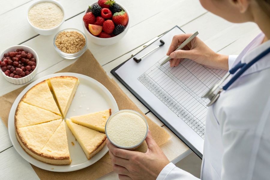 Kasza manna, jako składnik zagęszczający, wpływa na wartość energetyczną sernika w sposób umiarkowany – sama w sobie dostarcza około 350 kcal na 100g suchego produktu. W gotowym serniku stanowi jednak zwykle tylko 5-10% składu, więc jej wpływ na całkowitą kaloryczność jest relatywnie niewielki. W porównaniu do innych zagęstników, takich jak mąka ziemniaczana (około 340 kcal/100g) czy skrobia kukurydziana (około 370 kcal/100g), kasza manna nie wyróżnia się znacząco pod względem kaloryczności.