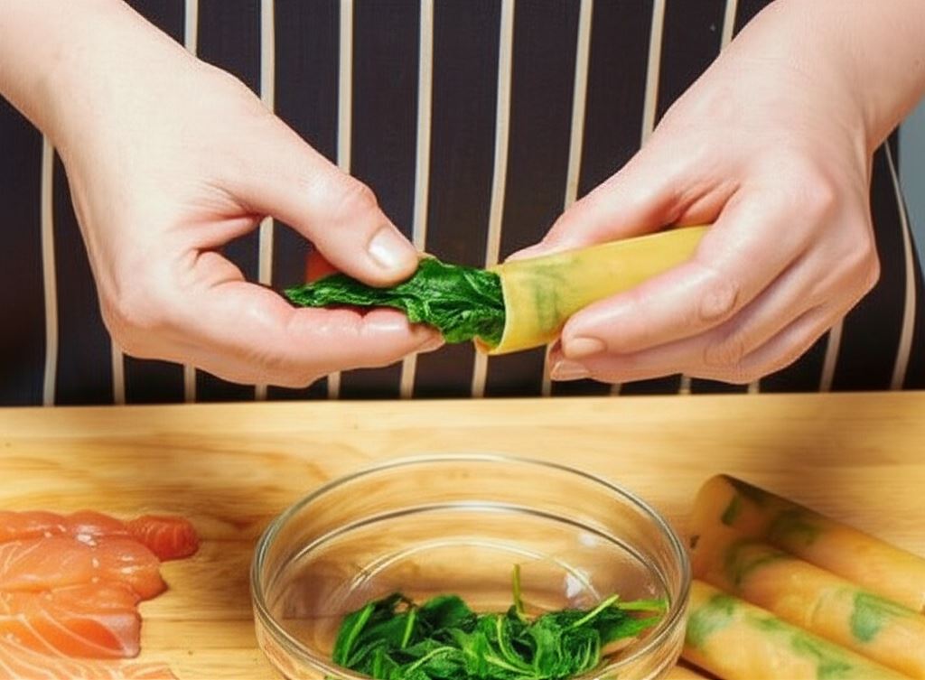 Posiekaj oliwki. Pokrój łososia na paski, o rozmiarze zbliżonym do rurek cannelloni. Owiń każdy kawałek łososia w liść szpinaku i włóż go do rurki cannelloni.