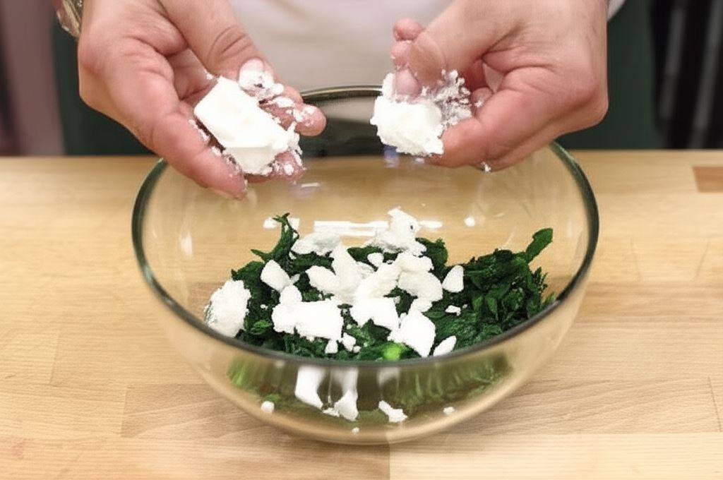 Szpinak odmroź i odciśnij. Potem posiekaj i wymieszaj z pokruszonym serem feta.