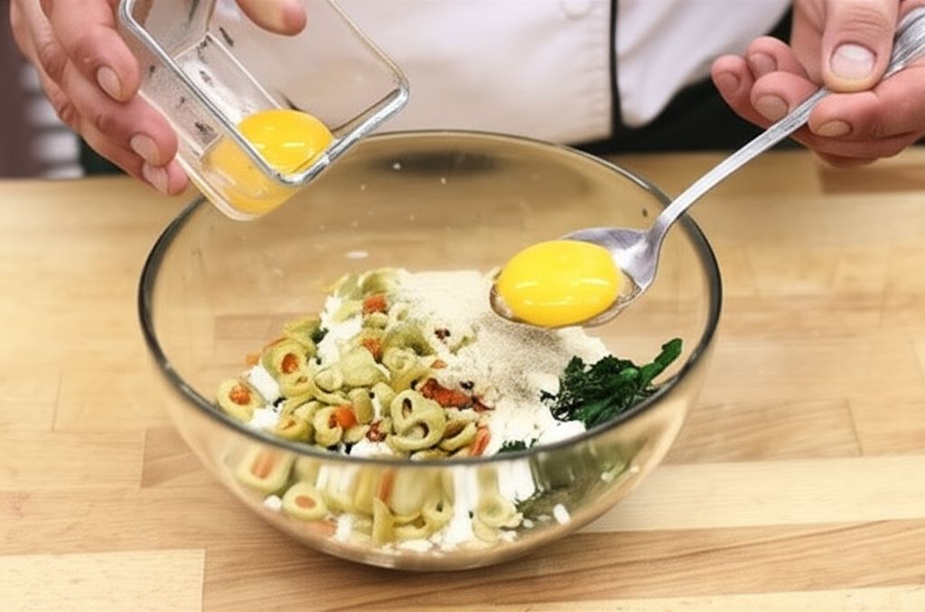 Wsyp pokrojone oliwki, żółtka i bułkę tartą. Starannie wymieszaj. Farsz powinien być dość zwarty.