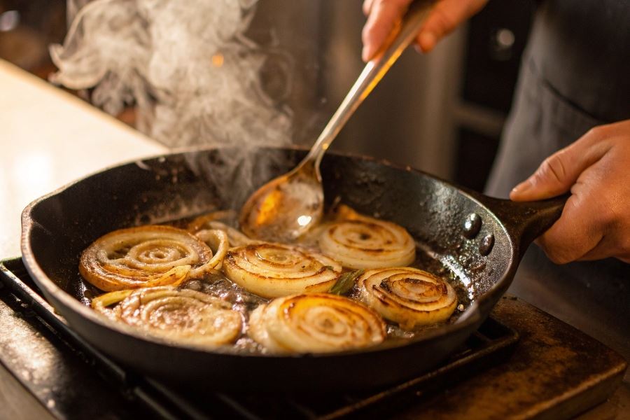 - Szczyptę soli dodaną na początku procesu – wydobywa wilgoć z cebuli