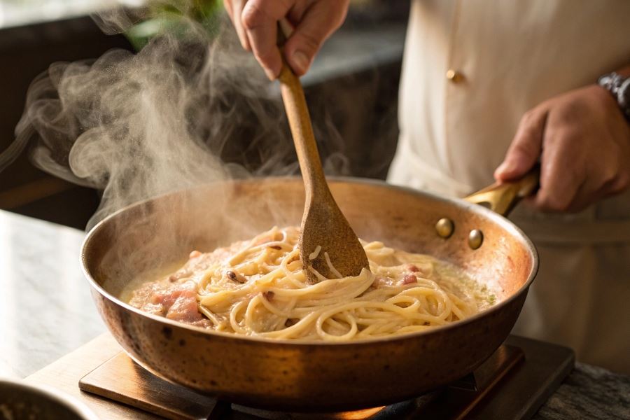 Carbonara najlepiej smakuje świeża, ale przy odpowiedniej technice podgrzewania można zachować jej wyjątkowy charakter. Kluczem jest cierpliwość i niska temperatura.