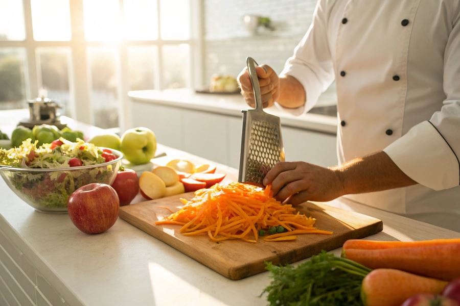 - Mieszane techniki – marchewka tarta drobno, jabłko w większych kawałkach dla kontrastu