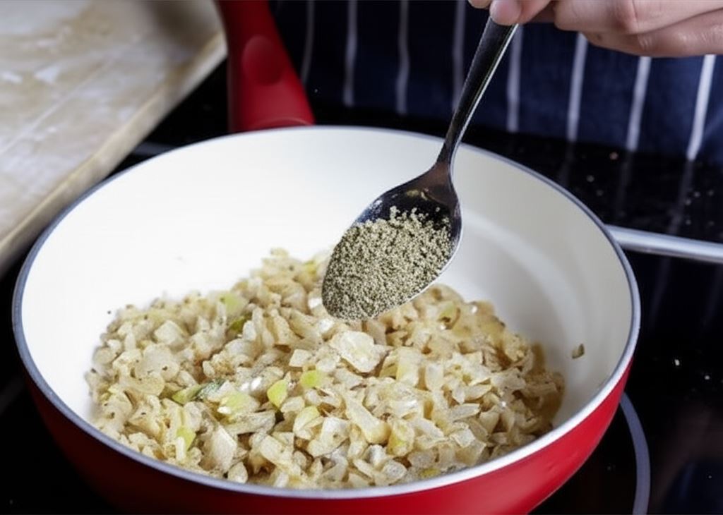 Kiedy ciasto wyrasta przygotuj cebulę. Pokrój ją razem z czosnkiem w niezbyt małą kostkę i zeszklij na patelni używając masła. Dodaj Majeranek i Kminek Knorr oraz wszystkie pozostałe przyprawy.