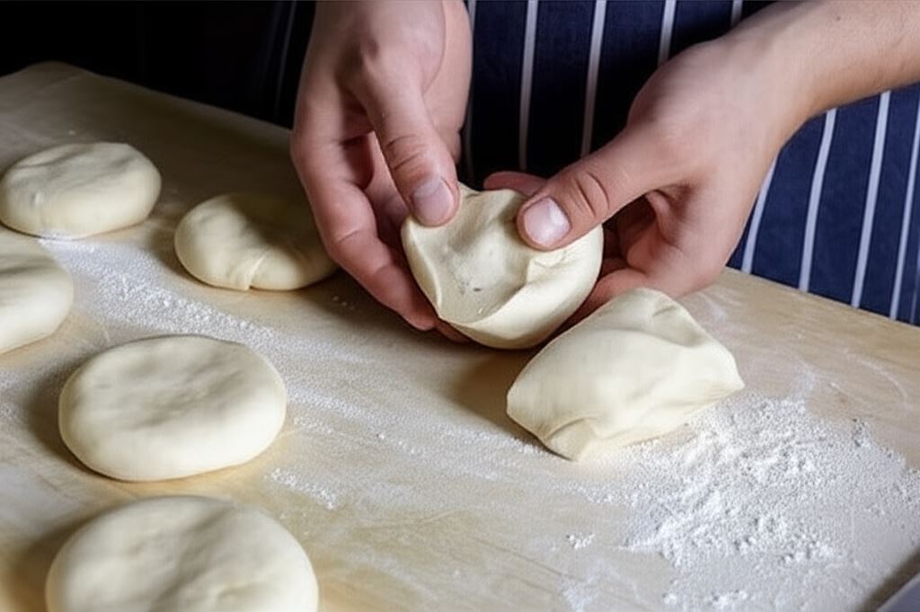 Kiedy ciasto urośnie, wyrabiaj je ponownie aż będzie gładkie i nie przykleja się do rąk. W razie potrzeby dodaj niewielką ilość mąki. Podziel ciasto na 10 części i uformuj z każdej kuleczkę. Rozpłaszcz je w dłoniach i umieść na blasze do piekarnika wyłożonej papierem do pieczenia.