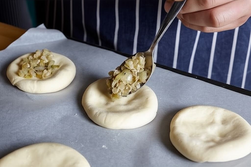Podsmażoną cebulę umieść na każdym placku drożdżowym. Nakryj całość ściereczką i odstaw znów do wyrośnięcia na około 20 minut. Potem piecz w nagrzanym wcześniej do 180 stopni piekarniku przez około 20-25 minut. Serwuj jako przekąskę.