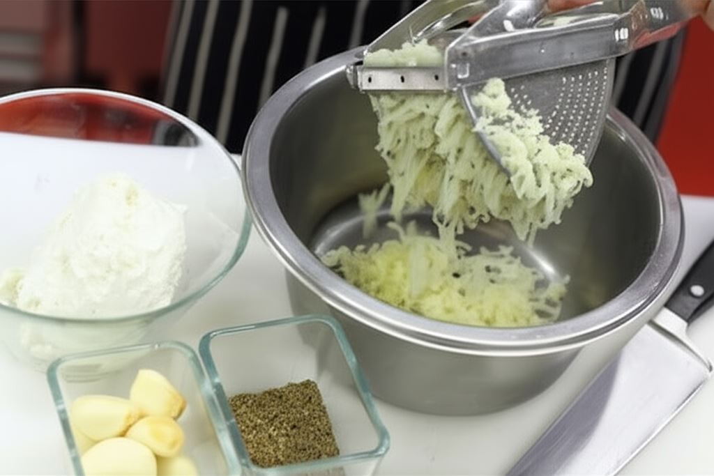 Sporządź farsz serowy. W miseczce wymieszaj zmielony twaróg z przeciśniętymi przez praskę ugotowanymi ziemniakami, czosnkiem, majerankiem i cebulą.