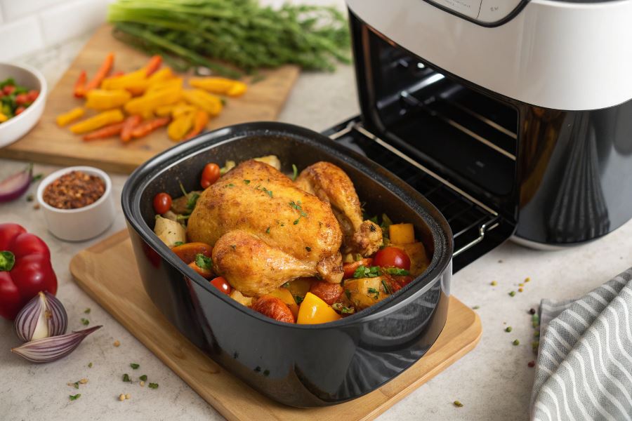 Zapiekanka z kurczakiem i warzywami, która w piekarniku potrzebuje 45 minut, w airfryerze będzie gotowa już po około 25-30 minutach – i to bez konieczności wstępnego nagrzewania urządzenia.