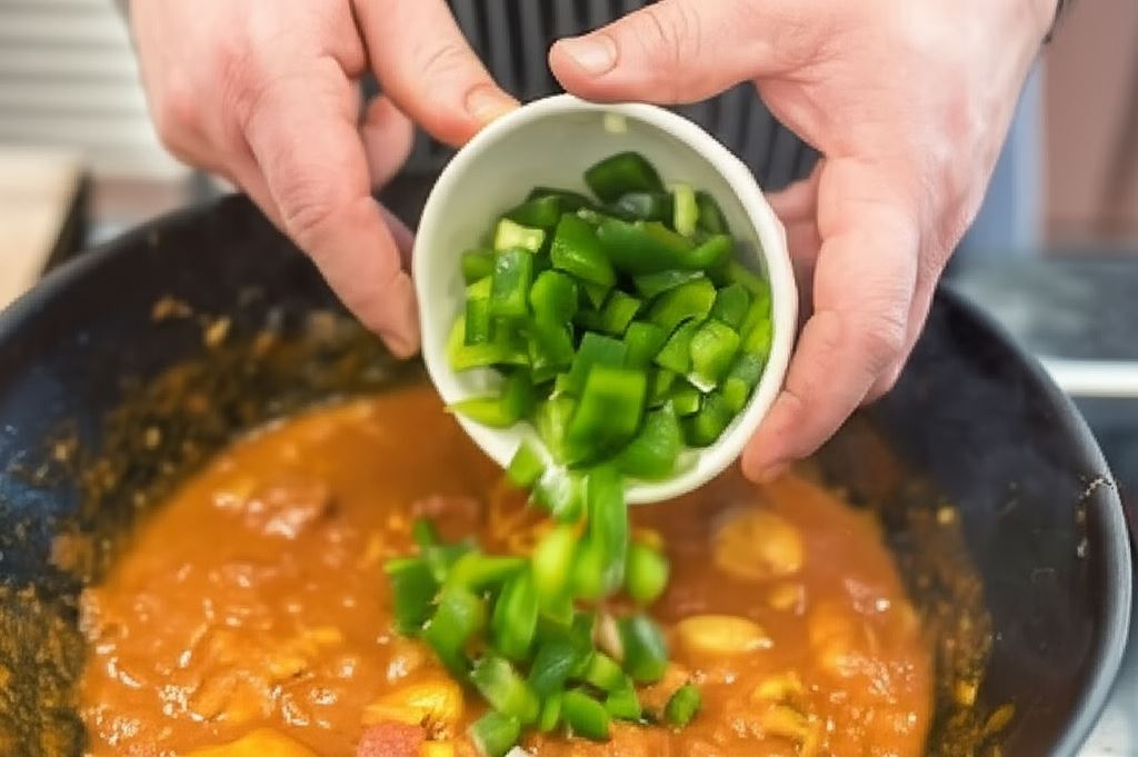 Po tym czasie wrzuć do kurczaka pomidory, zmniejsz ogień i nakryj garnek. Duś około 20 minut. Następnie dodaj jogurt i pokrojoną paprykę, gotuj jeszcze przez 10 minut.