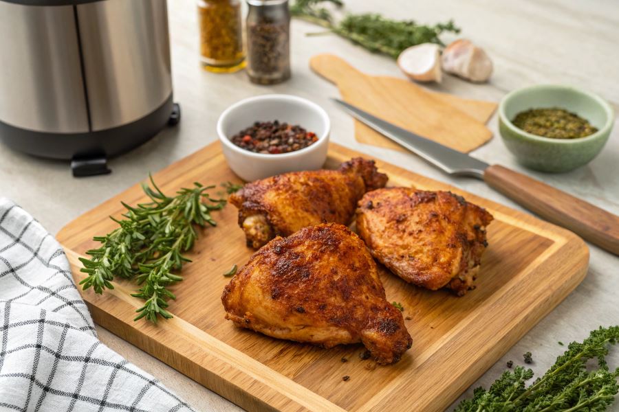 Udka z kurczaka przygotowane w airfryer zyskują chrupiącą skórkę przy zachowaniu soczystego mięsa wewnątrz. Do przygotowania klasycznej marynaty ziołowej potrzebujesz: