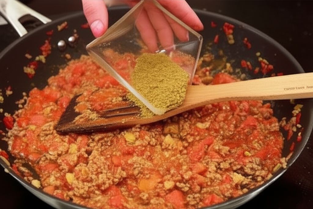 Dorzuć mielone mięso do warzyw. Smaż przy silnym ogniu, dopóki woda z duszenia całkowicie nie wyparuje. Dodaj do mięsa koncentrat pomidorowy, pomidory z puszki oraz kumin i kolendrę.