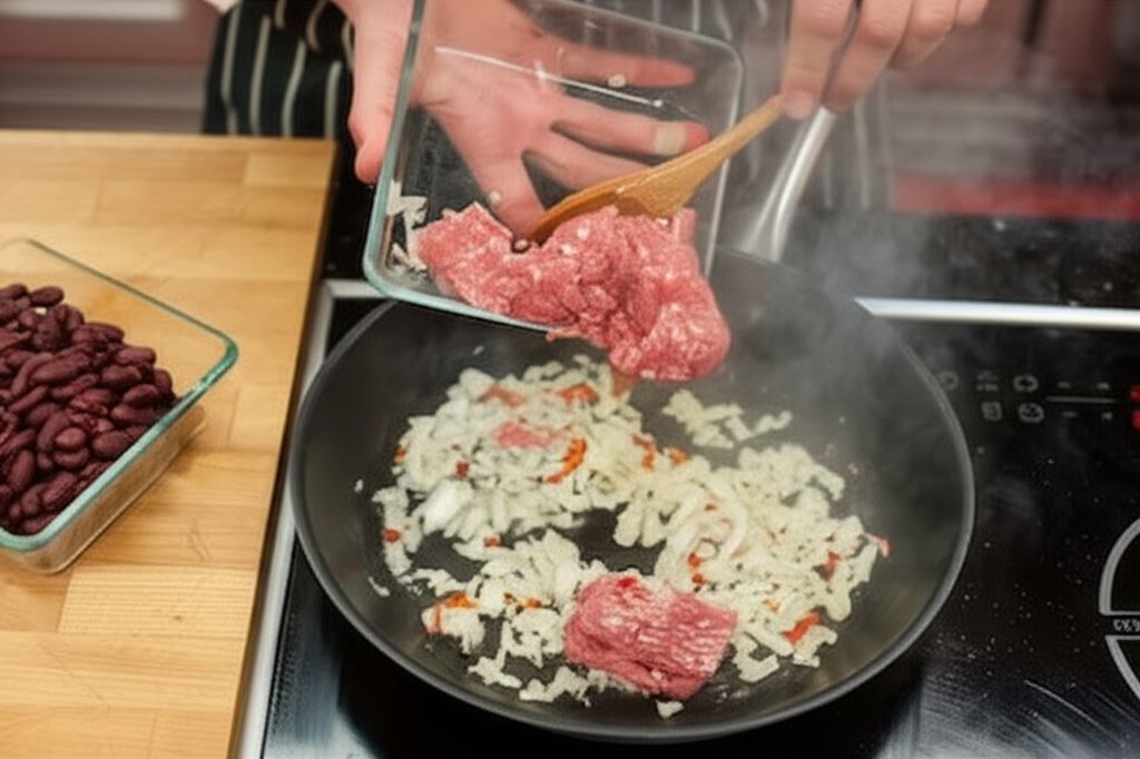 Cebulę posiekaj w kostkę, papryczkę pokrój i zrumień na patelni. Po chwili wsyp mięso i smaż, mieszając, by nie tworzyły się grudki.